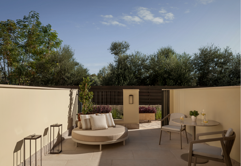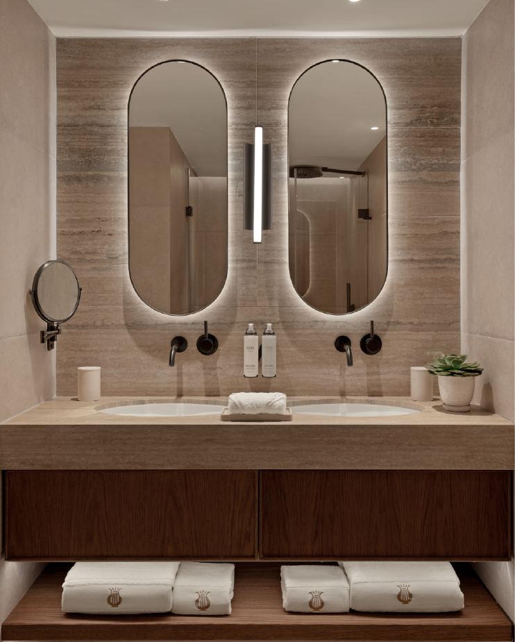 A cozy cottage vibe permeates throughout, thanks to the bronze and wood details and local stone cladding that feature prominently in all aspects of the Suite. A wooden staircase leads to a galleried mezzanine bedroom with a Mediterranean-inspired color scheme of natural tones that exudes an aura of relaxation and calm. Soft lighting and wooden paneling ensure that both privacy-seeking couples and families alike will delight in this genial space.